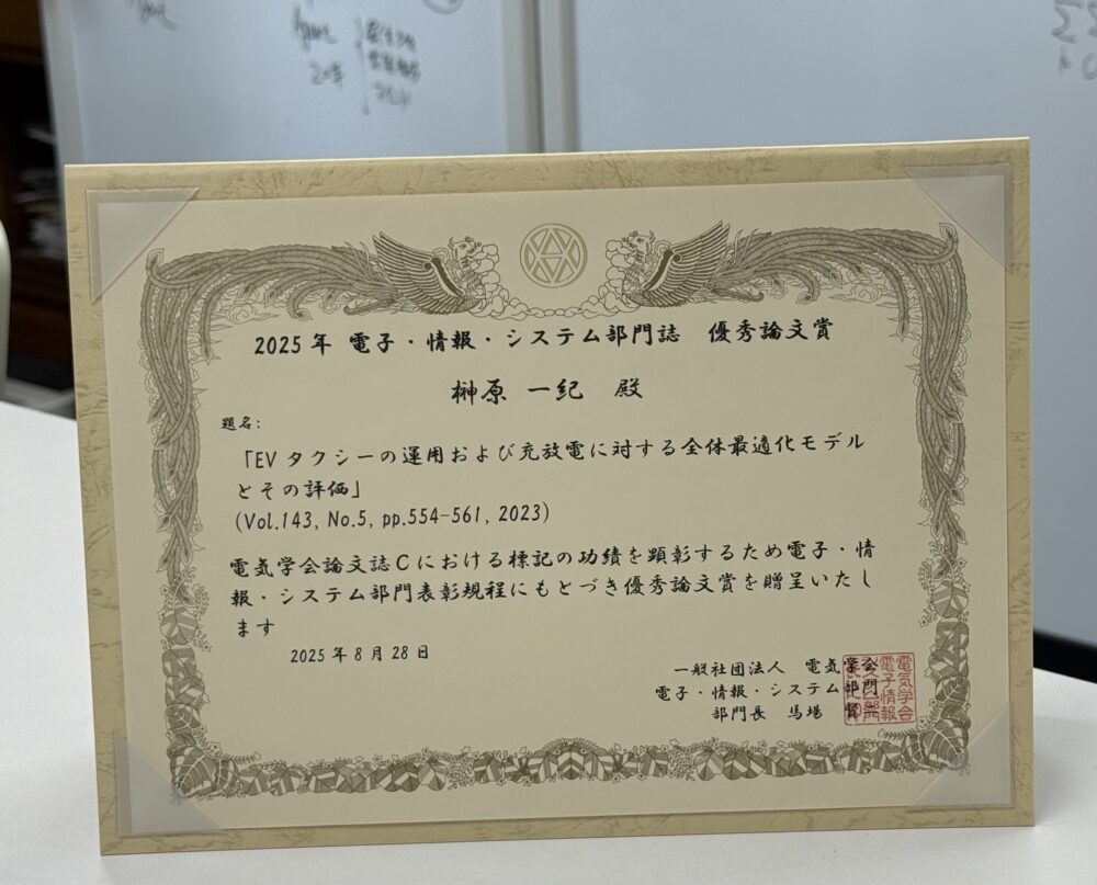 榊原研究室 博士後期課程修了の松崎さん,榊原教授らの論文「EVタクシーの運用および充放電に対する全体最適化モデルとその評価」(電気学会論文誌C(電子・情報・システム部門誌), 2023, 143 巻, 5 号, p. 554-561, 公開日 2023/05/01)が 電気学会 2025年度 電子・情報・システム部門誌 優秀論文賞を受賞しました.