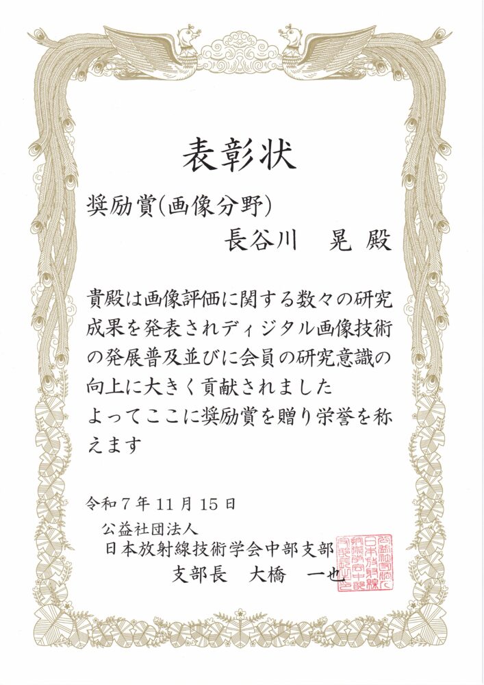 長谷川晃准教授が,公益社団法人日本放射線技術学会中部支部の奨励賞(画像分野)を受賞しました.おめでとうございます!